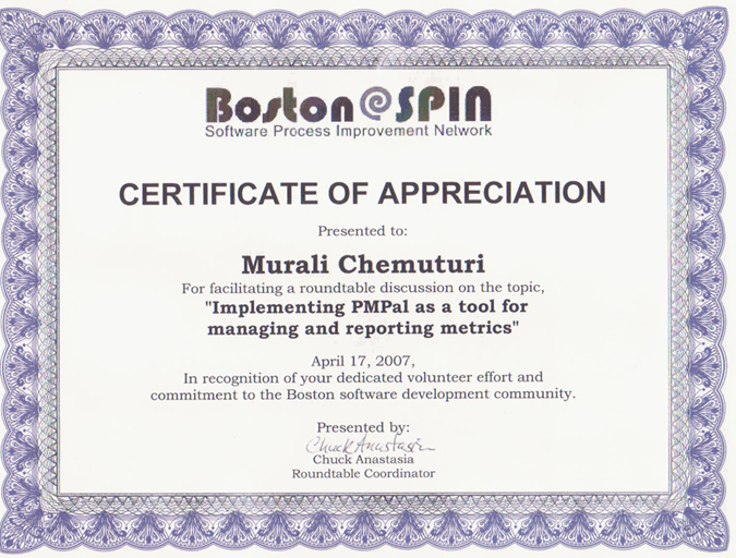 Murali Chemuturi facilitated a Round Table at Boston SPIN (Software Process Improvement Network) on the topic of "Implementing PMPal as a tool for managing and reporting metrics"