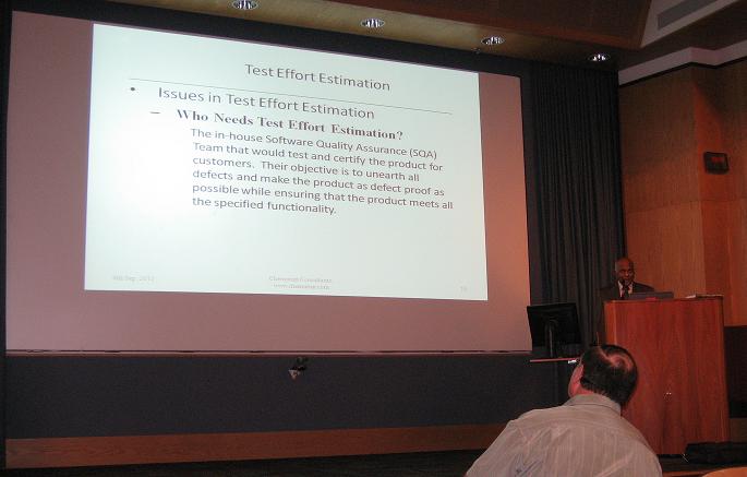 Murali Chemuturi delivering a lecture on Test Effort Estimation at Association for Software Engineering Excellence in Dallas, USA